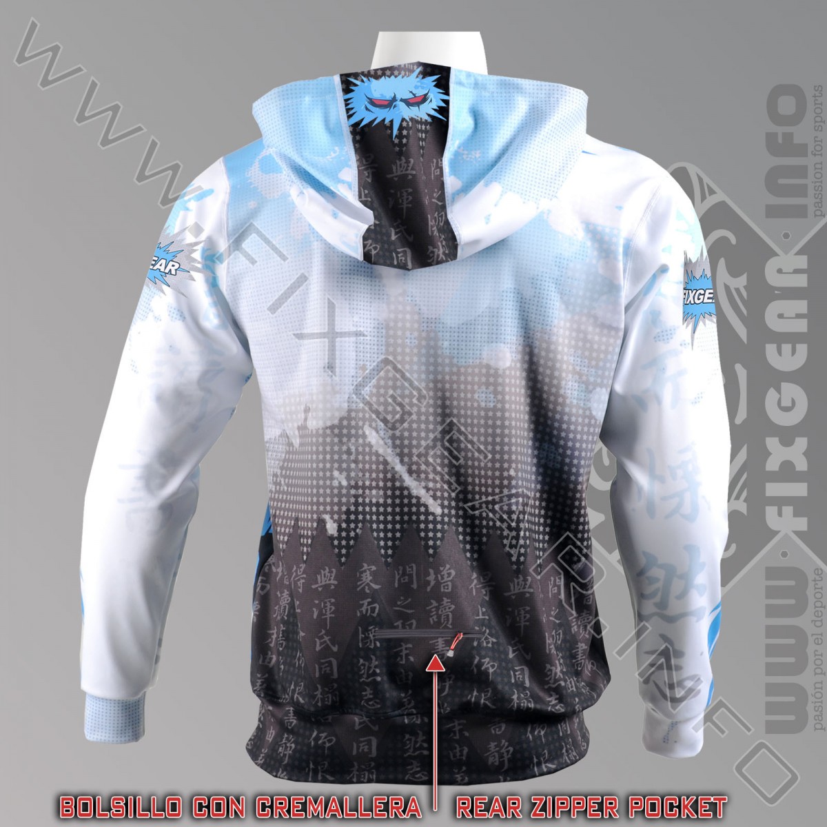 Nuestra hoodie no es una hoodie cualquiera. Compuesto totalmente de material elástico flexible y transpirable que a la vez es de rápido secado. Una prenda para meterle caña al deporte o lucir a diario. Para más comodidad en las carreras y entrenos, hemos innovado al eliminar todos los bolsillos "tradicionales" y hemos colcado sólo uno en la parte inferior de la espalda, perfecto para llevar un reporoductor de MP3, cartera, tarjeta de crédito, llave y/o algo de dinero. Cuenta con un detalle muy original que es que el interior de la capucha también lleva estampado.
